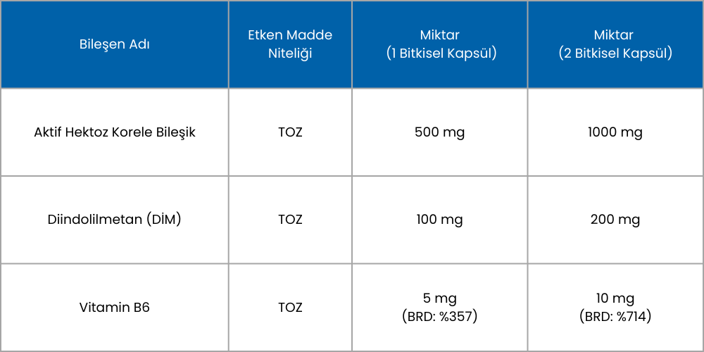 Her bir bitkisel kapsülde yer alan Aktif Heksoz Korele Bileşik, hücresel bağışıklığın desteklenmesine katkı sağlarken; sebzelerde doğal olarak bulunan DIM, vücuttaki östrojen dengesini korumaya yardımcı olur. Vücut tarafından kolayca kullanılan aktif B6 vitamini ise enerji üretimi ve bağışıklık sistemi fonksiyonlarının normal çalışmasını destekler.